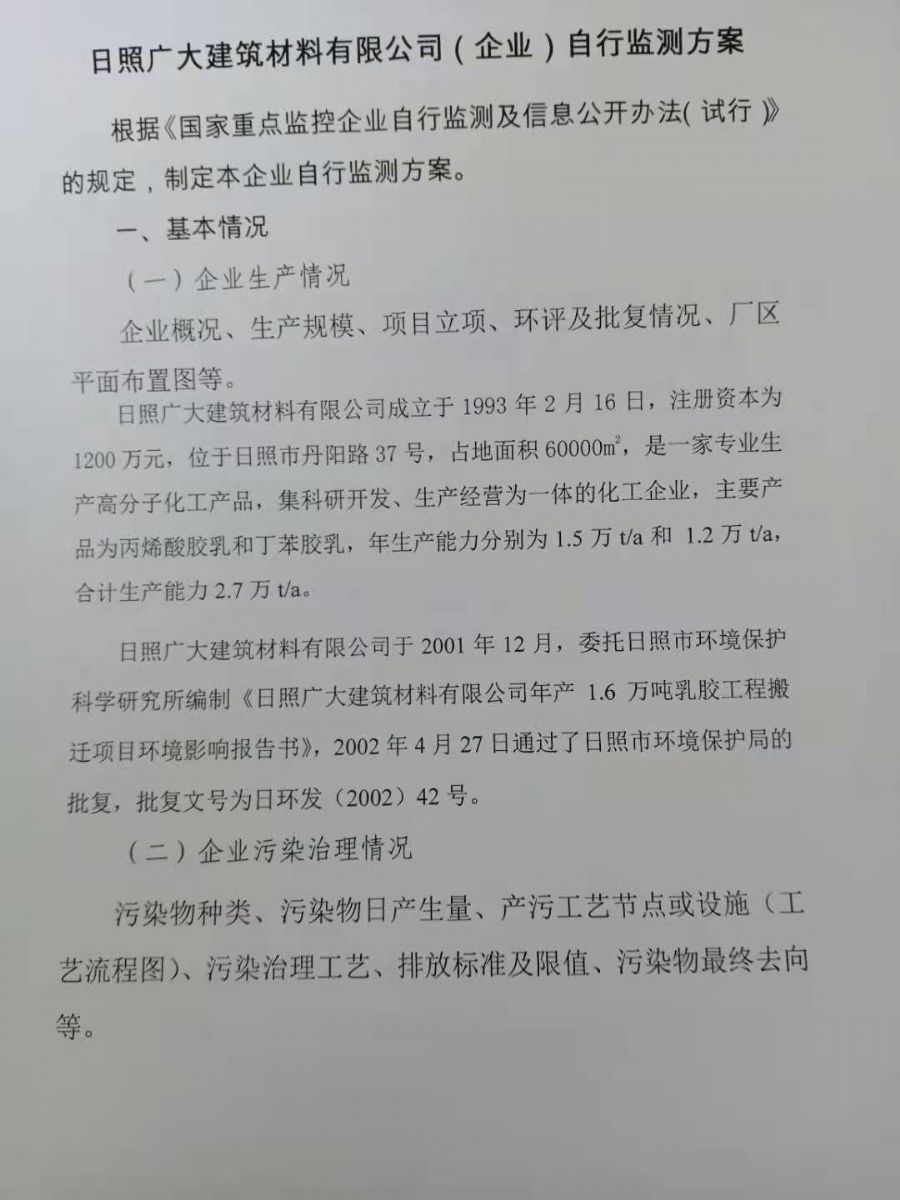 日照廣大建筑材料有限公司,位于風景秀麗的海濱城市山東日照,成立于1988年,是專業(yè)生產(chǎn)高分子化工產(chǎn)品,集科研開發(fā)、生產(chǎn)經(jīng)營為一體的化工企業(yè),主要產(chǎn)品為丙烯酸脂類乳液和丁苯膠乳。是國內目前江北同行業(yè)產(chǎn)銷量最大企業(yè)之一。